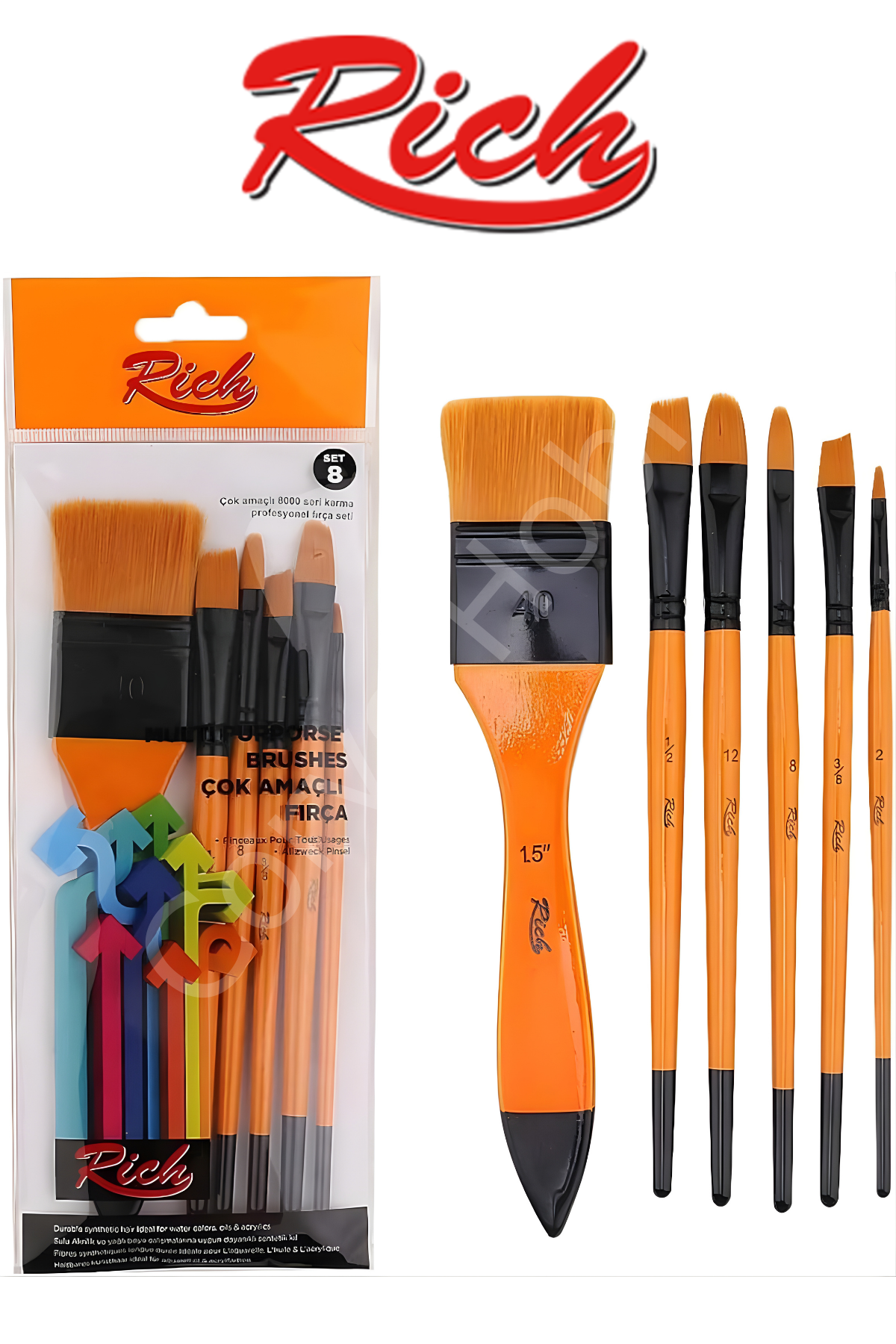 Çok Amaçlı Rich 8000 Serisi Karma Profesyonel Fırça Seti Set8 Set içeriğinde1 Adet Zemin Fırçası3 Adet Kedi Dili Uçlu Fırça2 Adet Yan Kesik Uçlu Fırça bulunmaktadırHobi ve sanatsal çalışmalara uygun dayanıklı sentetik kıl uçludur.